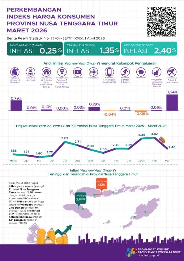 KUPANG, NUSA FLOBAMORA–Badan Pusat Statistik (BPS) NTT mencatat, pada Maret 2026 terjadi inflasi year on year (y-on-y) Provinsi Nusa Tenggara Timur sebesar 2,40 persen dengan Indeks Harga Konsumen (IHK) sebesar 110,41.