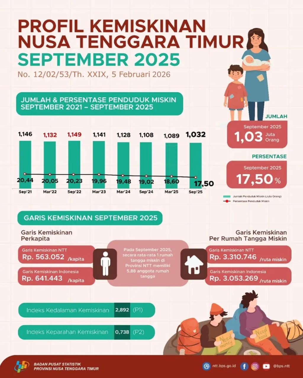 KUPANG. NUSA FLOBAMORA– Badan Pusat Statistik (BPS) NTT pada Kamis 5 Februari 2026 merilis, persentase penduduk miskin pada September 2025 sebesar 17,50 persen, menurun 1,10 persenpoin terhadap Maret 2025 dan menurun1,52 persenpoin terhadap September 2024.